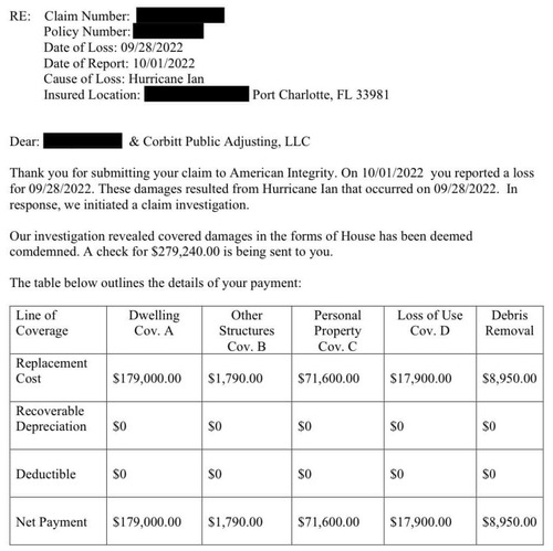 We contacted Corbitt Public Adjusters when we were not making any progress on our insurance claim after Hurricane Ian. First contact with Jerry Daniels was very positive and gave us the confidence to trust in the Corbitt team to resolve our claim. It took 18 months for us to get the claim resolved and involved the services of an attorney but we managed to settle for considerably more than we expected thanks to the excellent work of the Corbitt team. They are very highly recommended for anyone having problems settling their insurance claim.